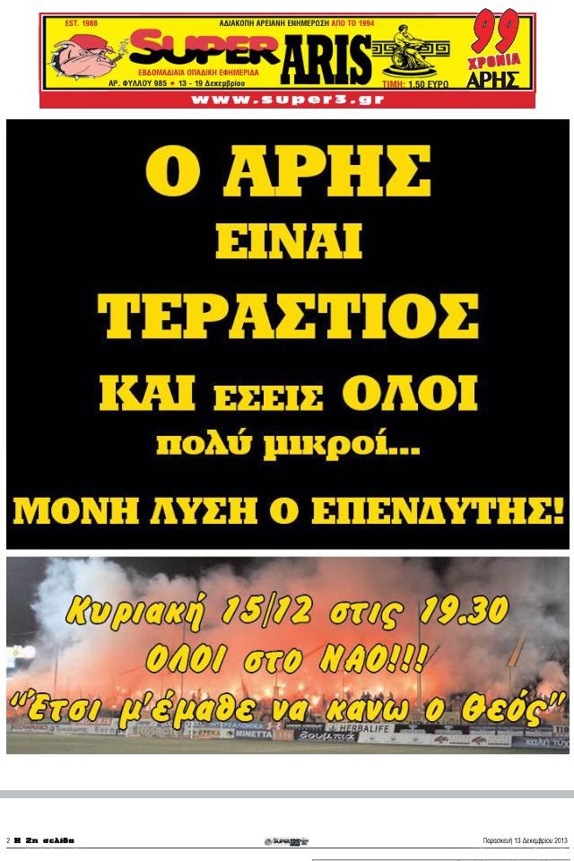 Το πρωτοσέλιδο της εφημερίδας Super Aris (φύλλο 986)